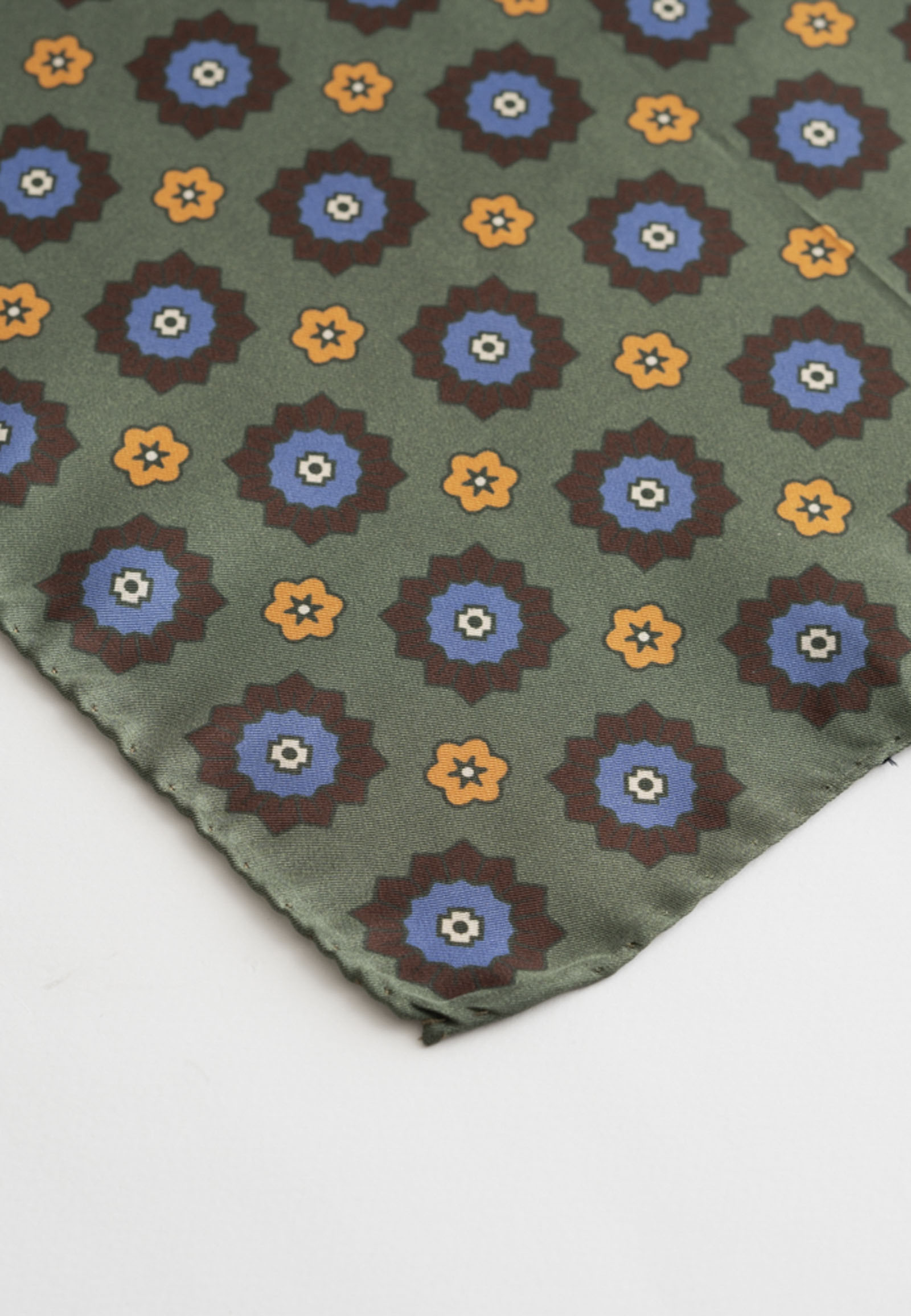 Green printed silk pocket square. An elegant accessory completes the style of the blazers in the cοllection with a modern touch.