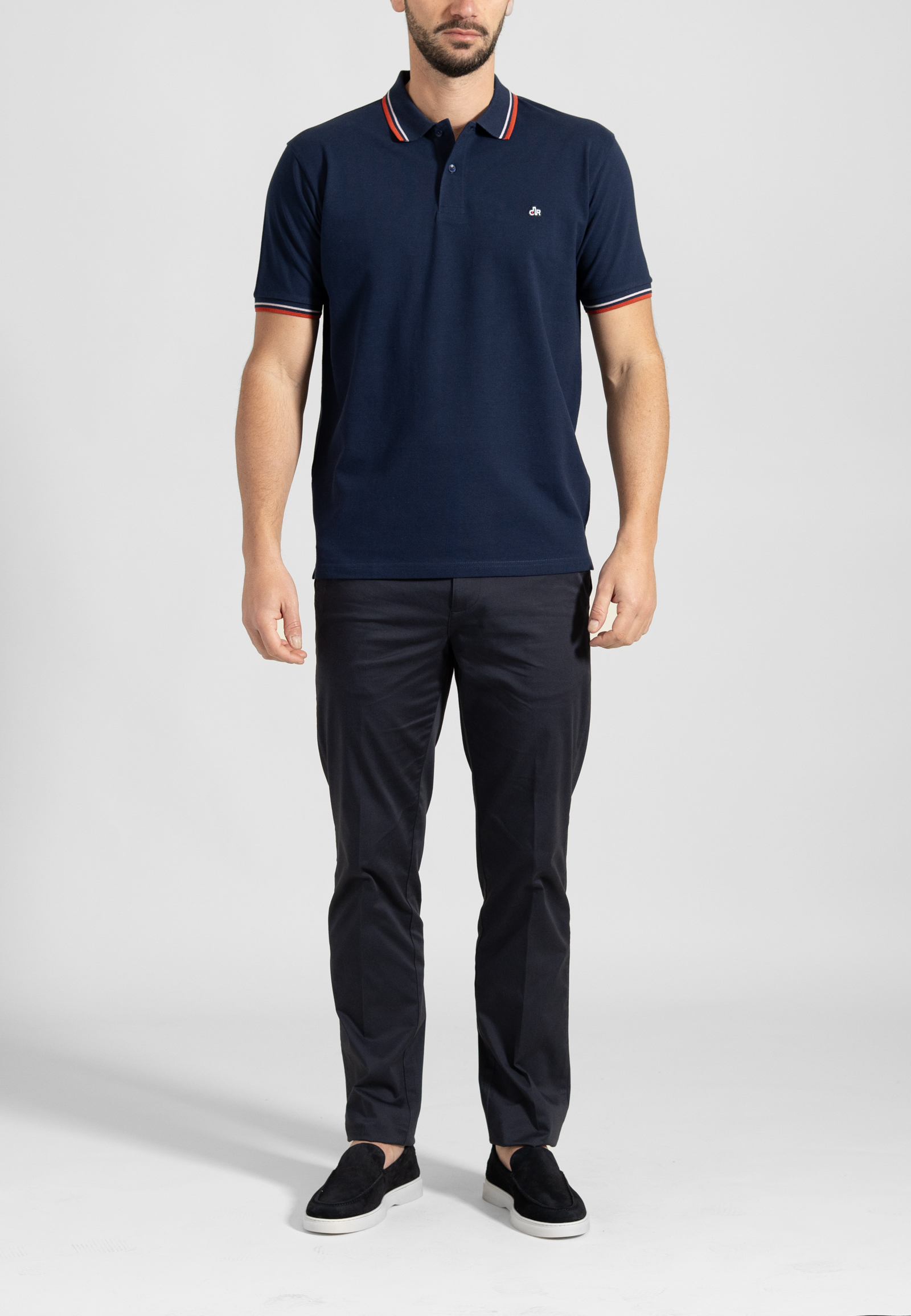 Regular fit combed cotton polo shirt with two contrasting stripes on collar and sleeve. Piquet structured made of fine yarns, two fildisi buttoned placket, rip collar, short sleeves with rip endings, side slits and emroidered logo at the chest.