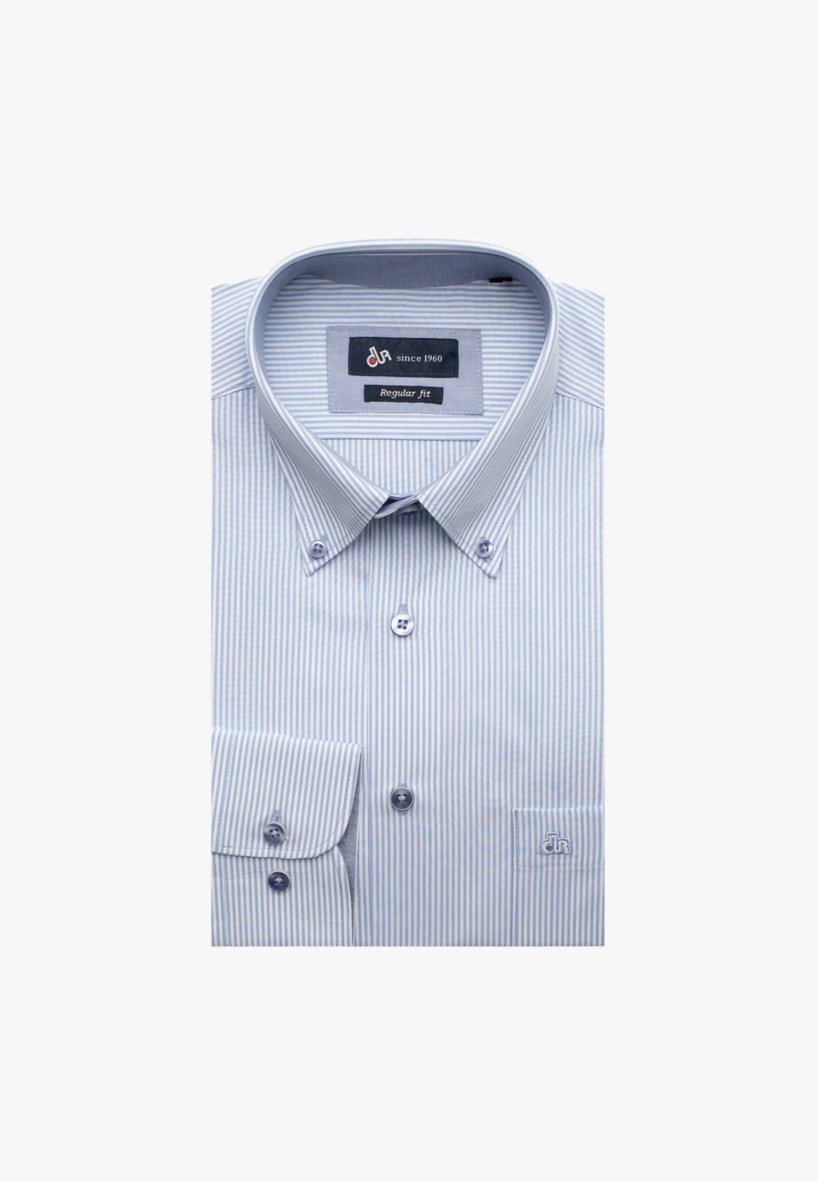 Striped shirt with contrast trim inside collar and cuffs in regular fit. Button down collar, mitered pocket with embroidered the brand logo, round cuffs and french front. Side pleats at the back for ease of movement. The brand logo embroidered on chest.