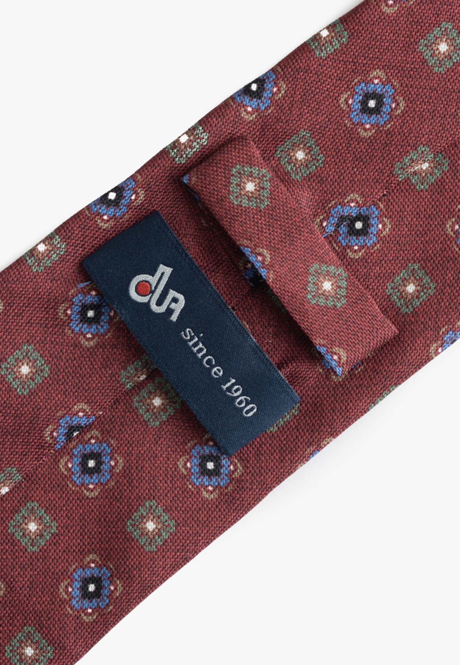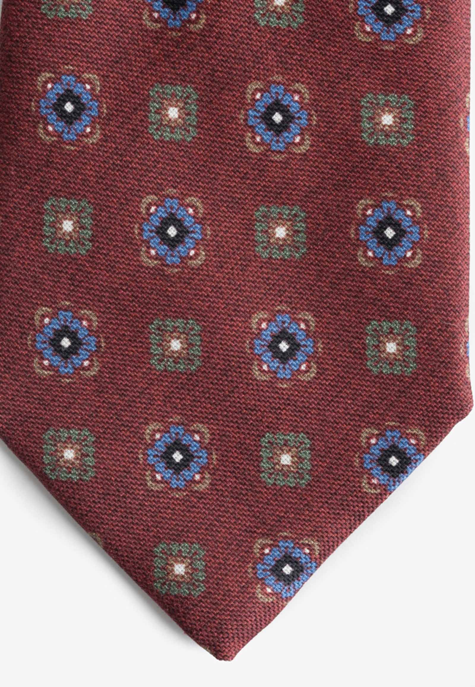 Μπορντό μεταξωτή γραβάτα με μπλε-πράσινο σχέδιο λουλούδι. Η πίσω πλευρά είναι ντουμπλαρισμένη με φόδρα.