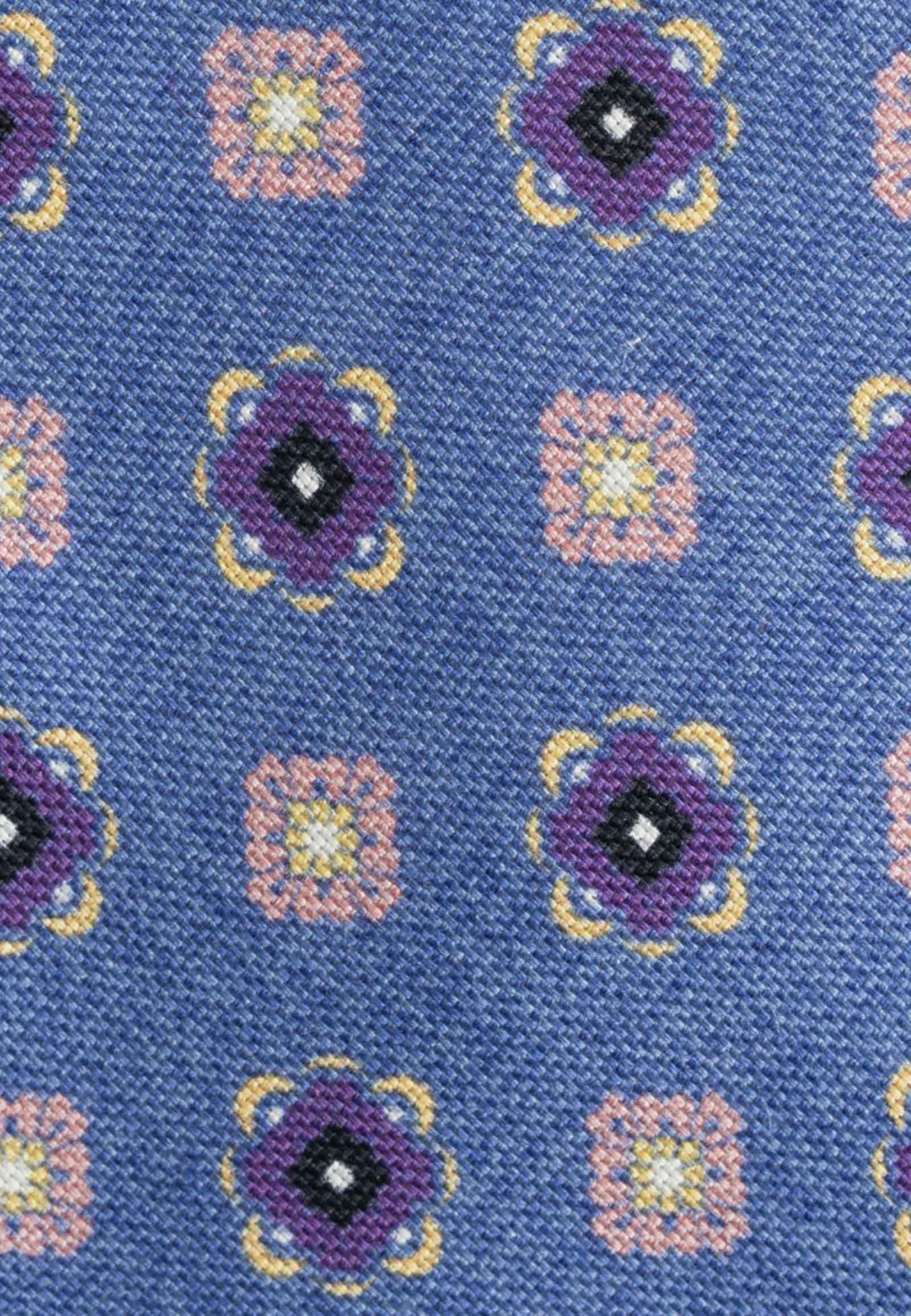 Γαλάζια μεταξωτή γραβάτα με μωβ σχέδιο λουλούδι. Η πίσω πλευρά είναι ντουμπλαρισμένη με φόδρα.