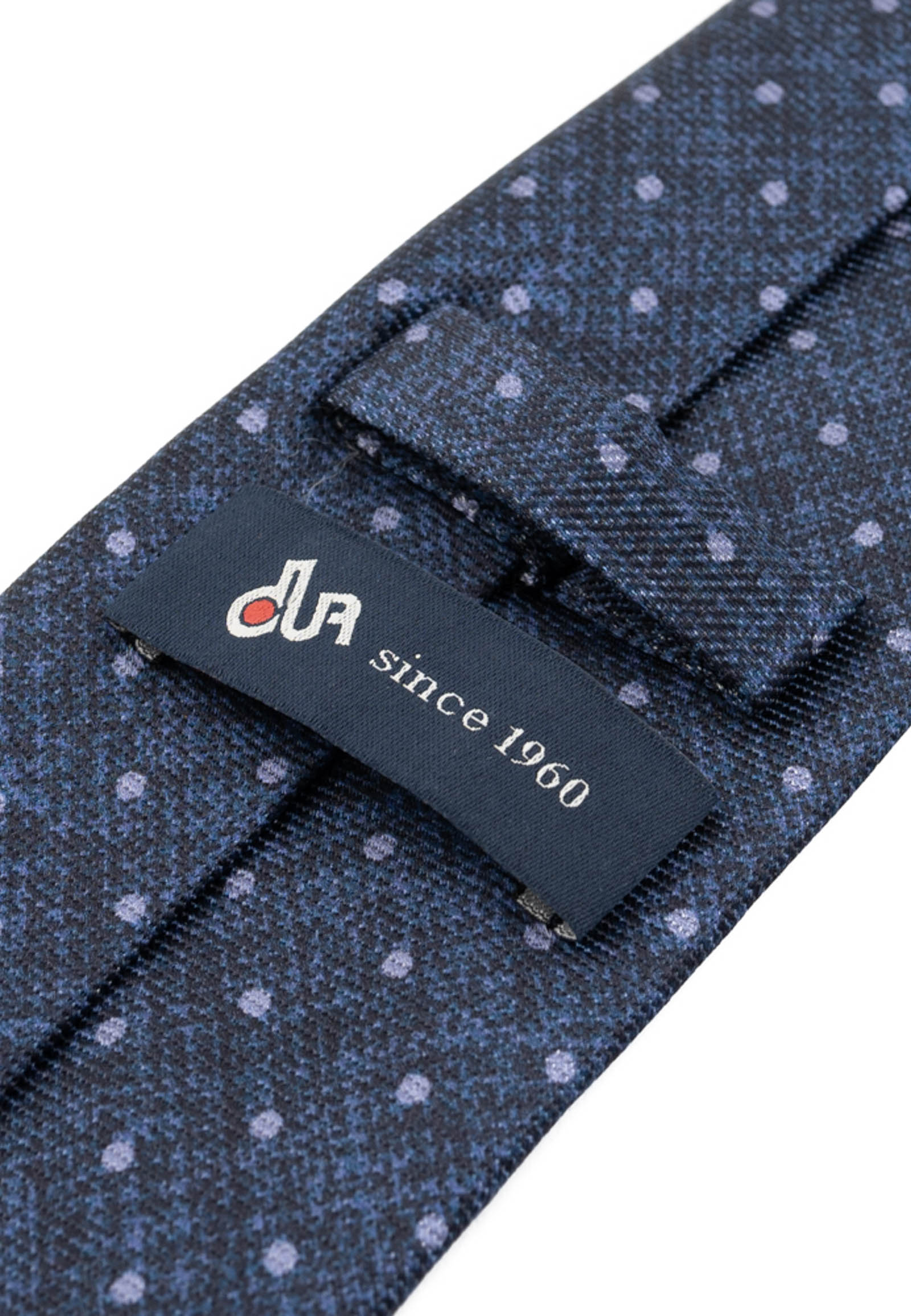 Γραβάτα από 100% μετάξι, με σχέδιο στάμπας πουά και φόντο χρώματος blue jean μελανζέ.