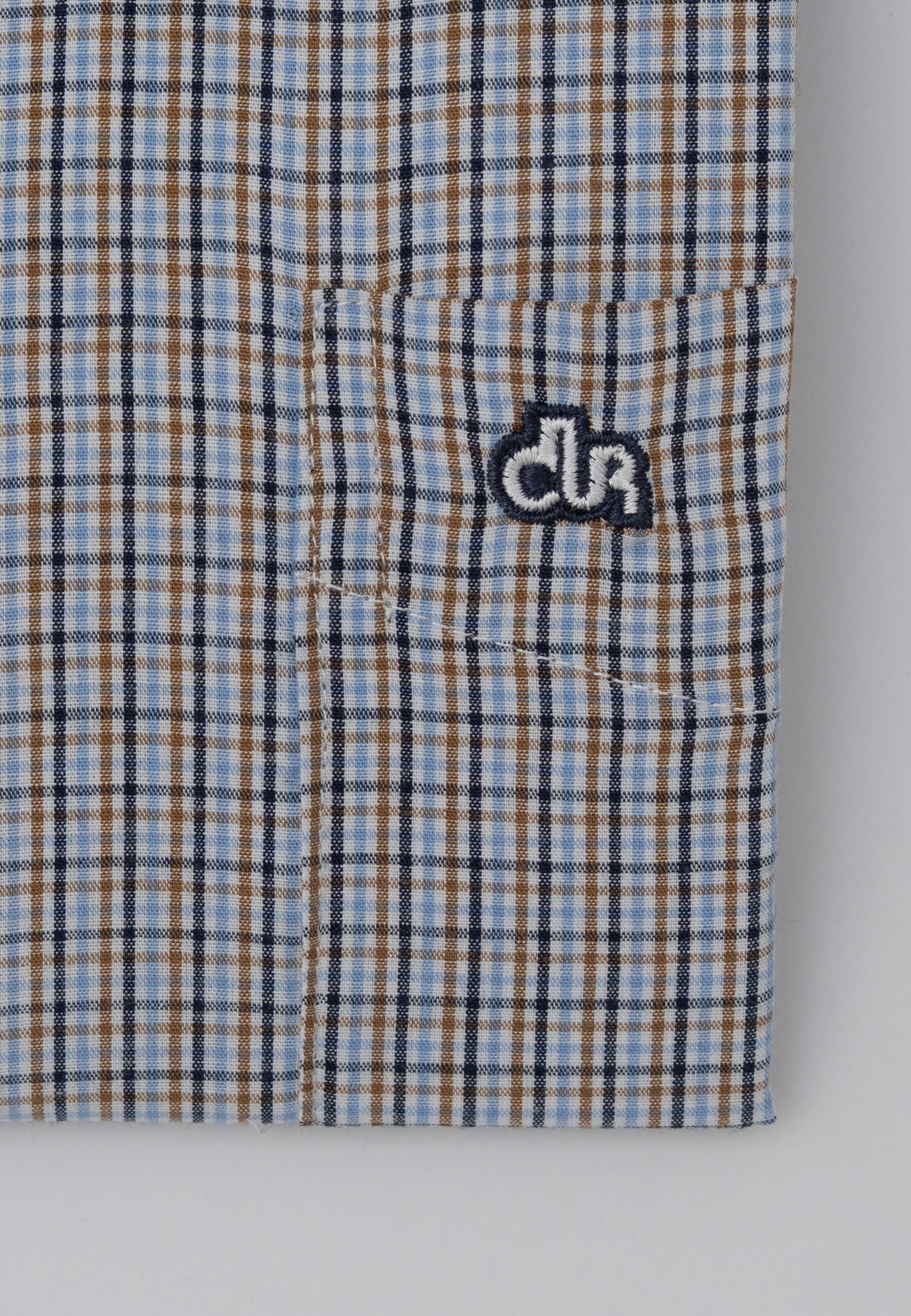 Πουκάμισο μικρό καρό με κοντό μανίκι σε κανονική γραμμή. Γιακάς με κουμπί, τσέπη τρίγωνη, κλείσιμο με πατιλέτα 7 κουμπιών. Το λογότυπο κεντημένο στην τσέπη.