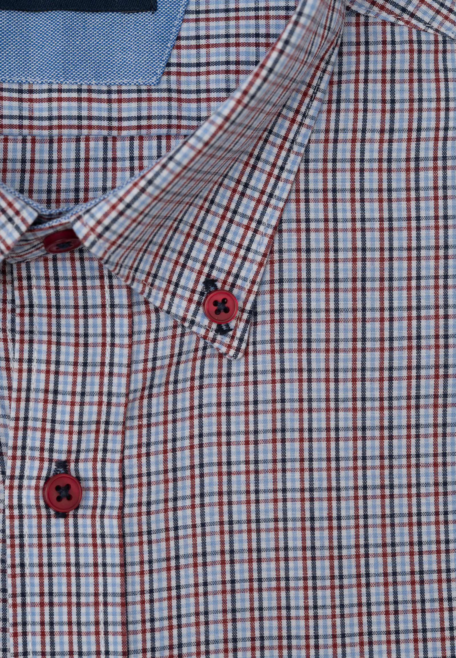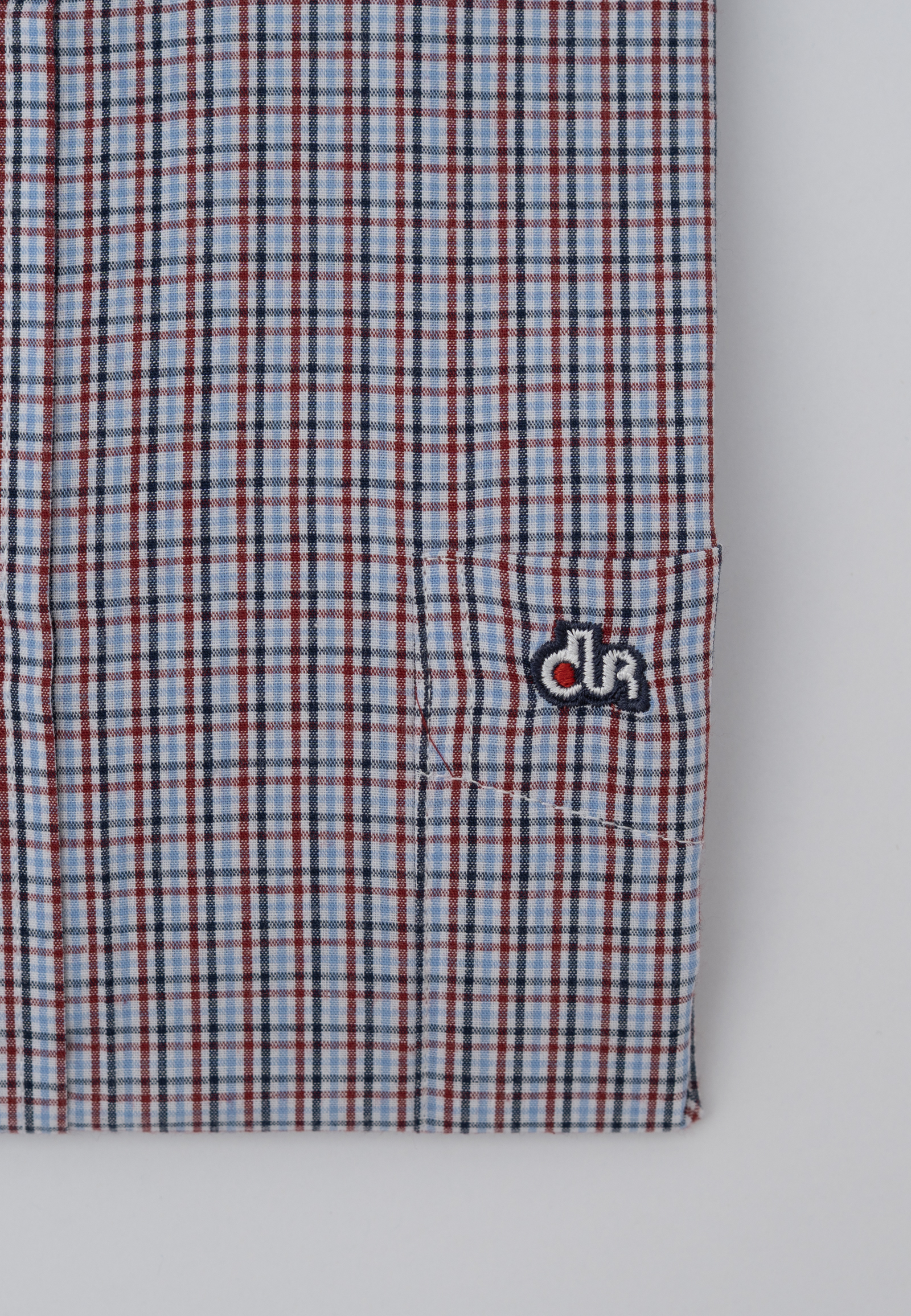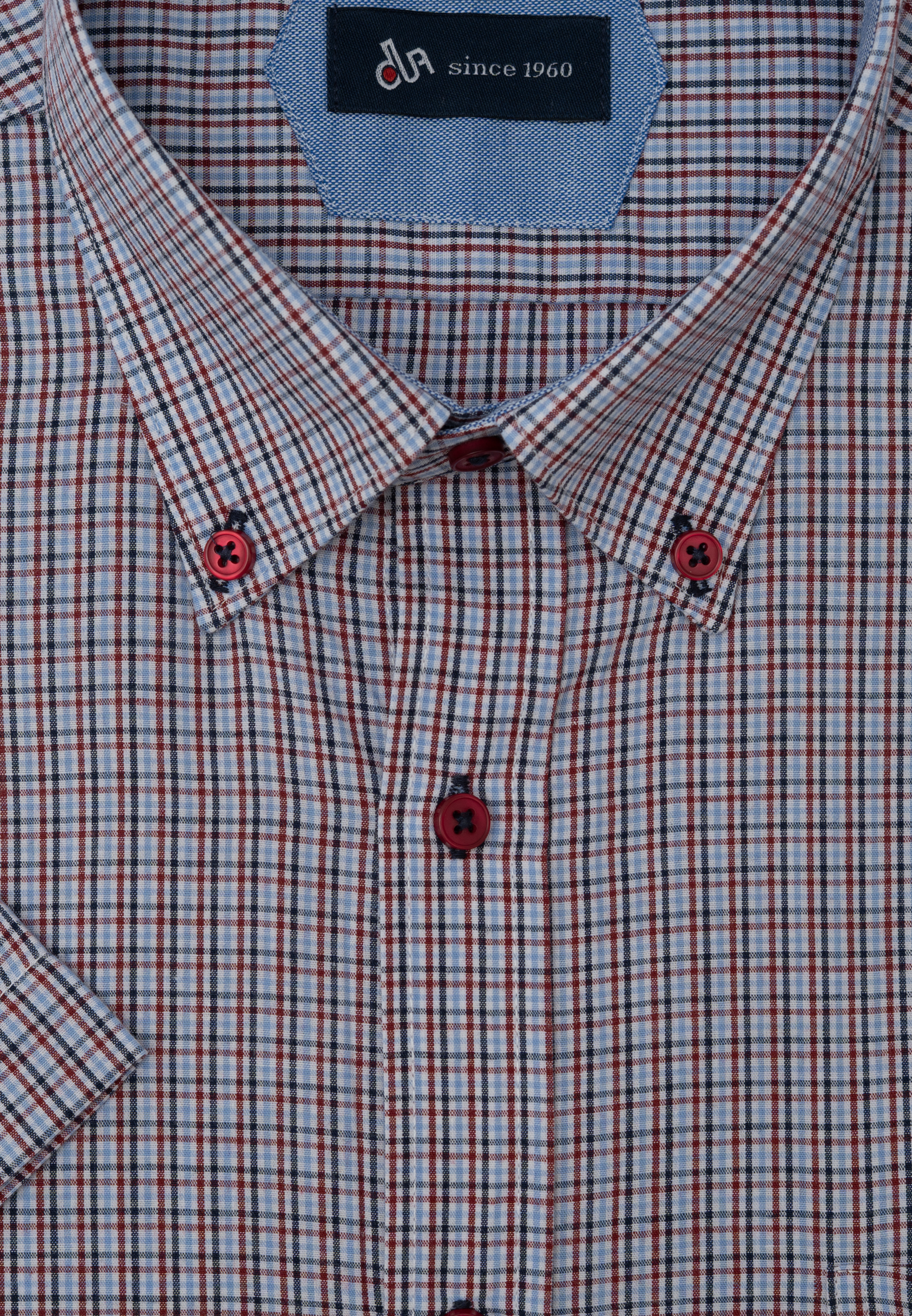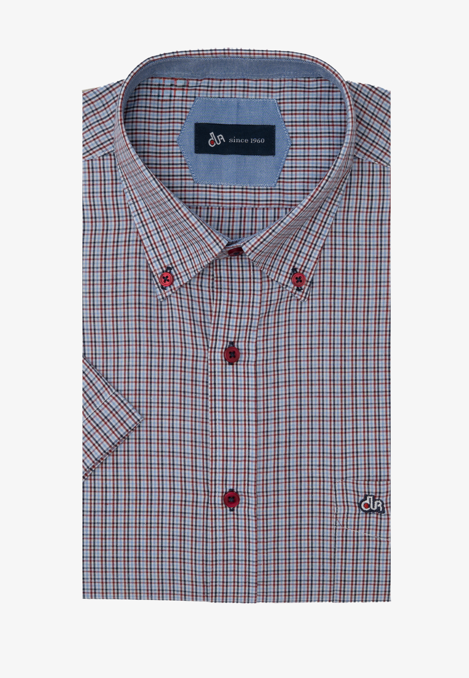 Πουκάμισο μικρό καρό με κοντό μανίκι σε κανονική γραμμή. Γιακάς με κουμπί, τσέπη τρίγωνη, κλείσιμο με πατιλέτα 7 κουμπιών. Το λογότυπο κεντημένο στην τσέπη.