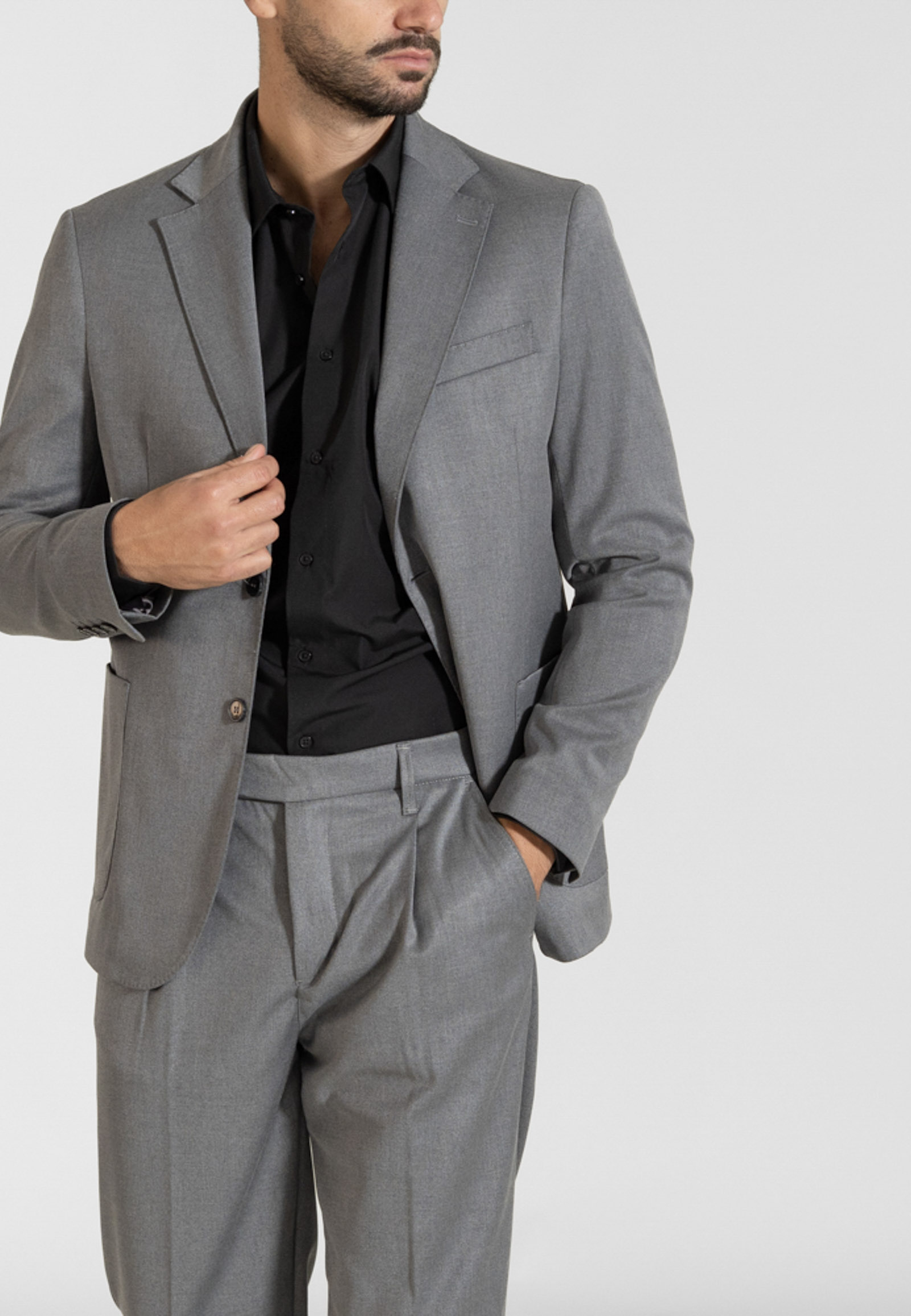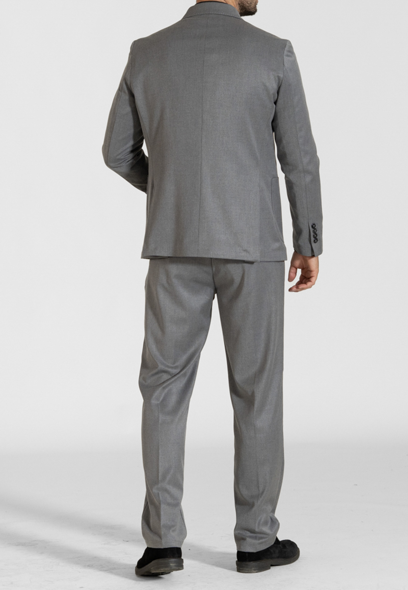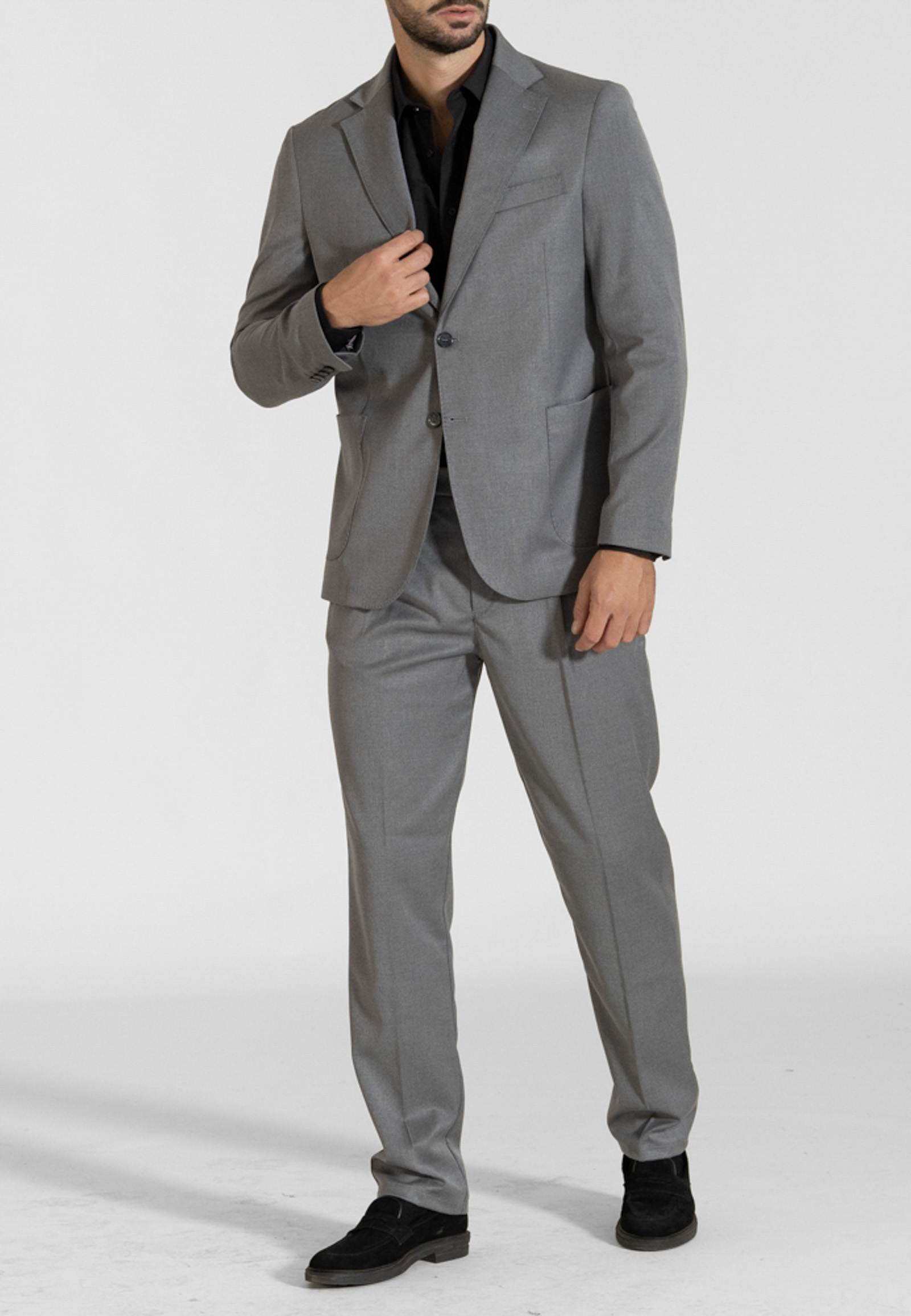 Κοστούμι χρώματος γκρι σε κανονική γραμμή. Αντοχή στο τσαλάκωμα και ραφή στο πέτο και στο γιακά που δίνει την αίσθηση χειροποίητου ρούχου.