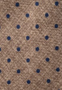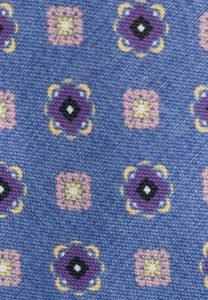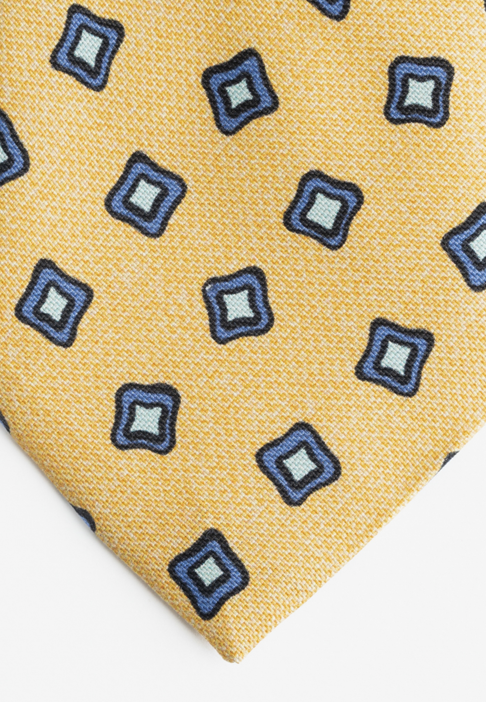 Μουσταρδί μεταξωτή γραβάτα με μπλε γεωμετρικά σχέδια. Η πίσω πλευρά είναι ντουμπλαρισμένη με φόδρα.