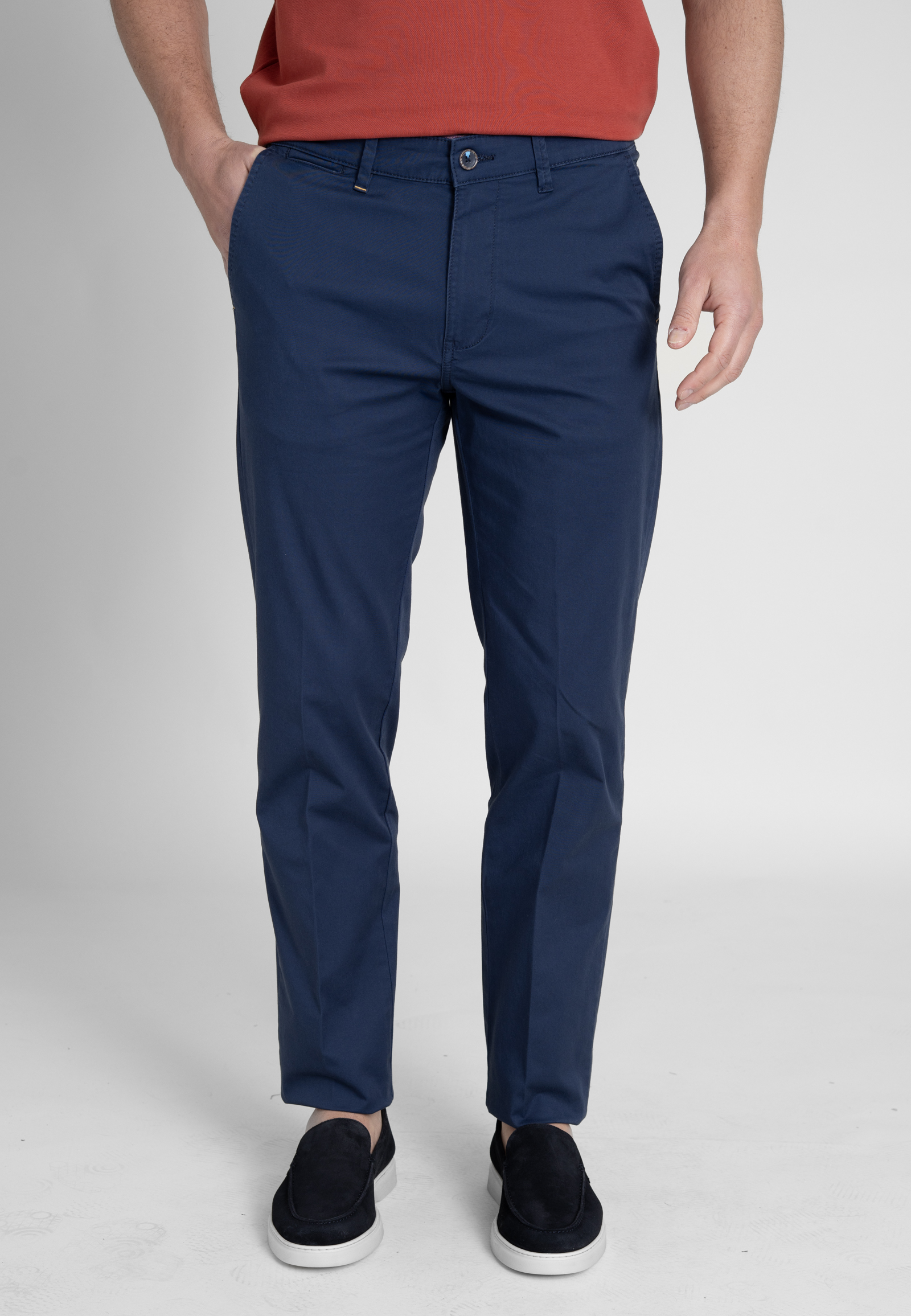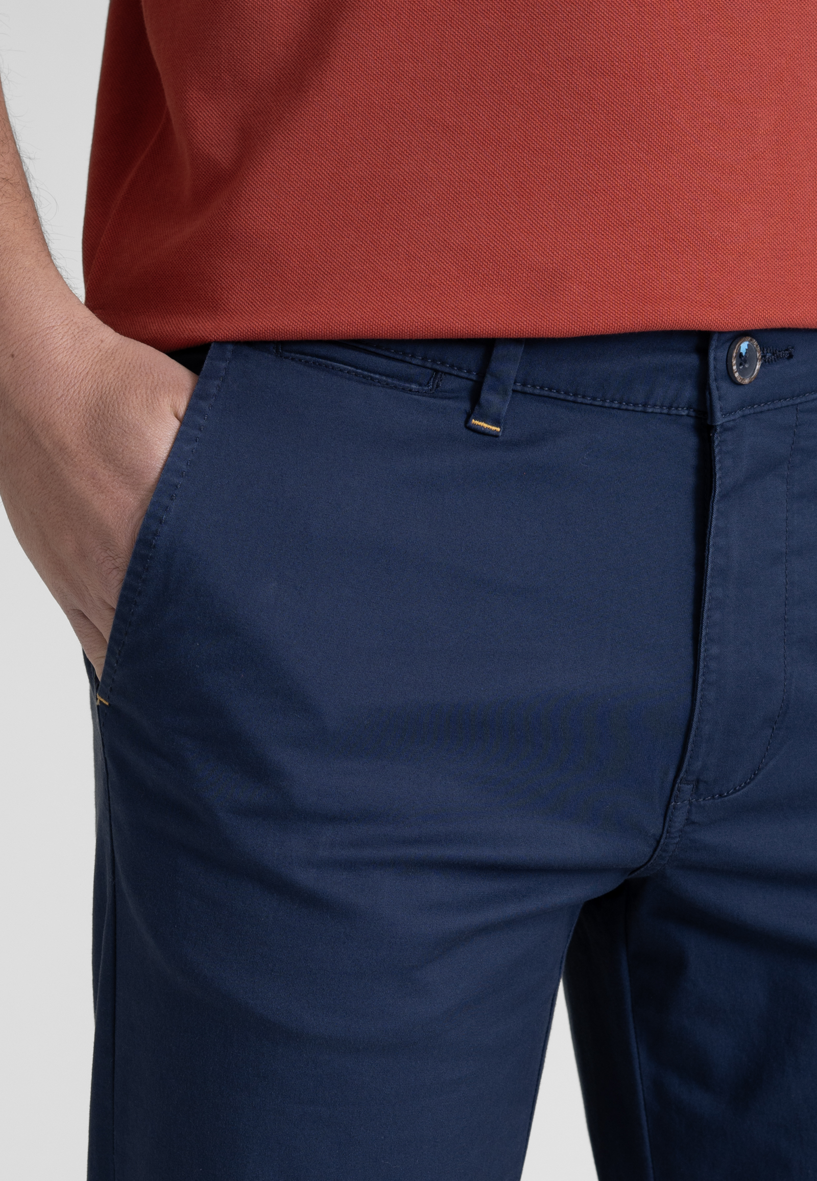 Παντελόνι chino λεπτή καπαρντίνα από άνετο ελαστικό βαμβακερό ύφασμα σε κανονική γραμμή. Εφαρμογή μέσης σε μεσαίο ύψος, κλείσιμο με κουμπί, δύο τσέπες στα πλάγια και δύο ρελιαστές τσέπες με κουμπί στην πίσω πλευρά.
