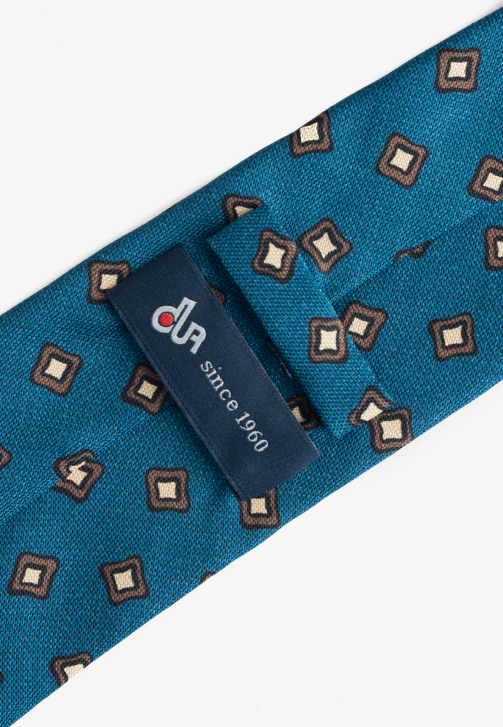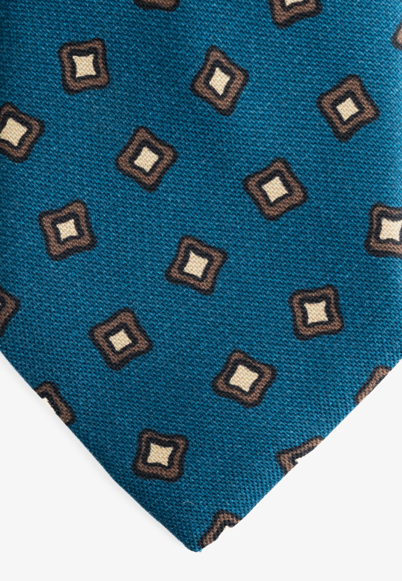 Πετρόλ μεταξωτή γραβάτα με λαδί γεωμετρικά σχέδια. Η πίσω πλευρά είναι ντουμπλαρισμένη με φόδρα.