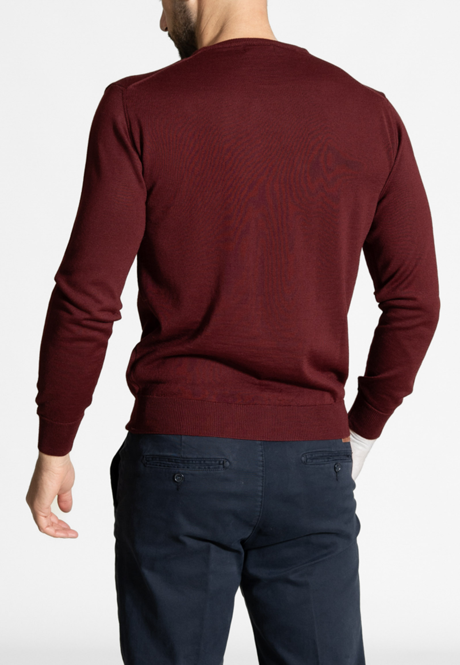 Πλεκτό λαιμόκοψη από extra fine μαλλί μερινός σε κανονική γραμμή. Ύφανση λεπτή και ριπ τελείωμα στο κάτω μέρος και στο μανίκι.