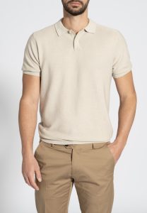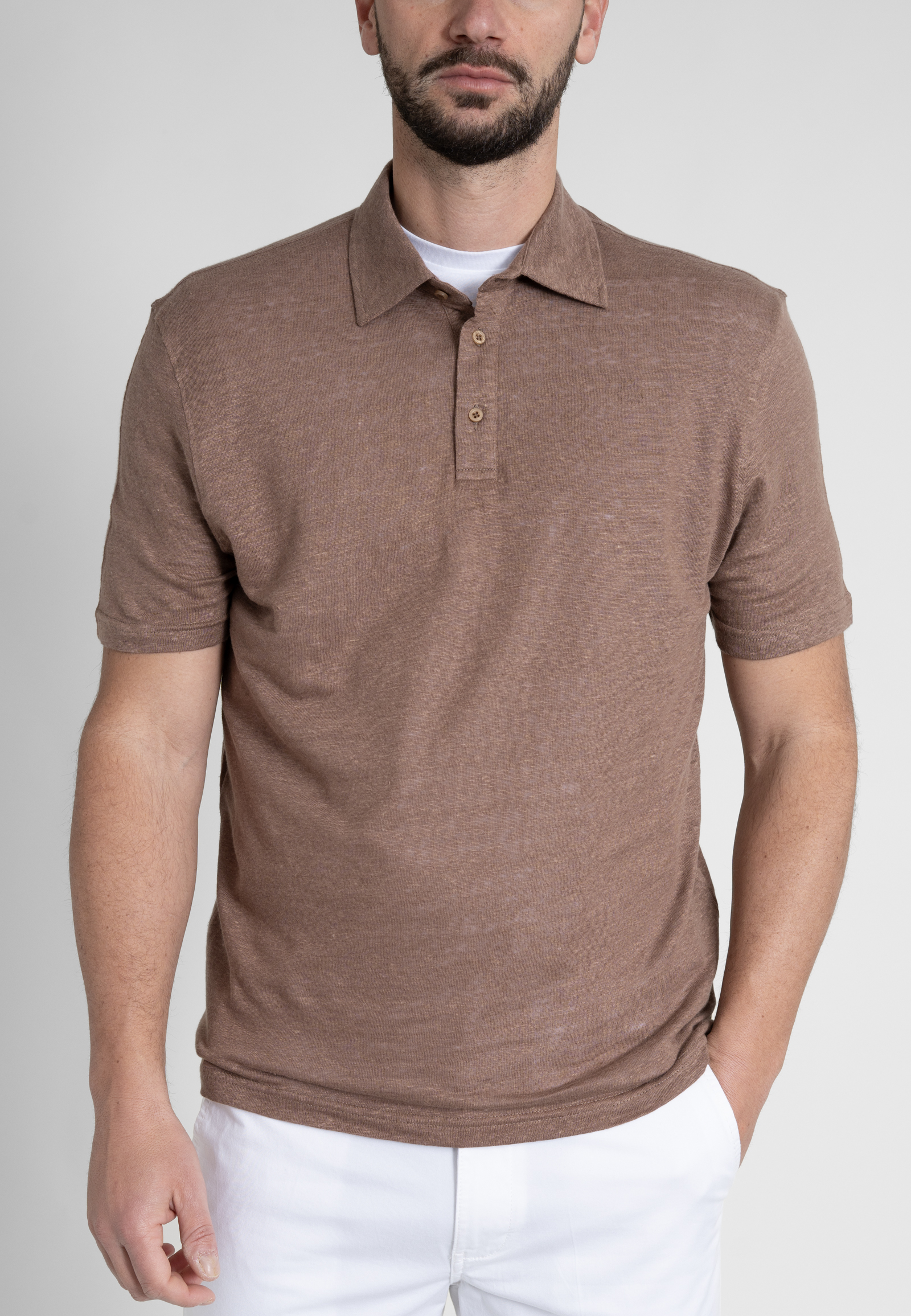 Πόλο από λινό ‘melange’ σε κανονική γραμμή. Γιακάς πουκαμίσου, πατιλέτα με τρία κουμπιά και μανίκι κοντό.