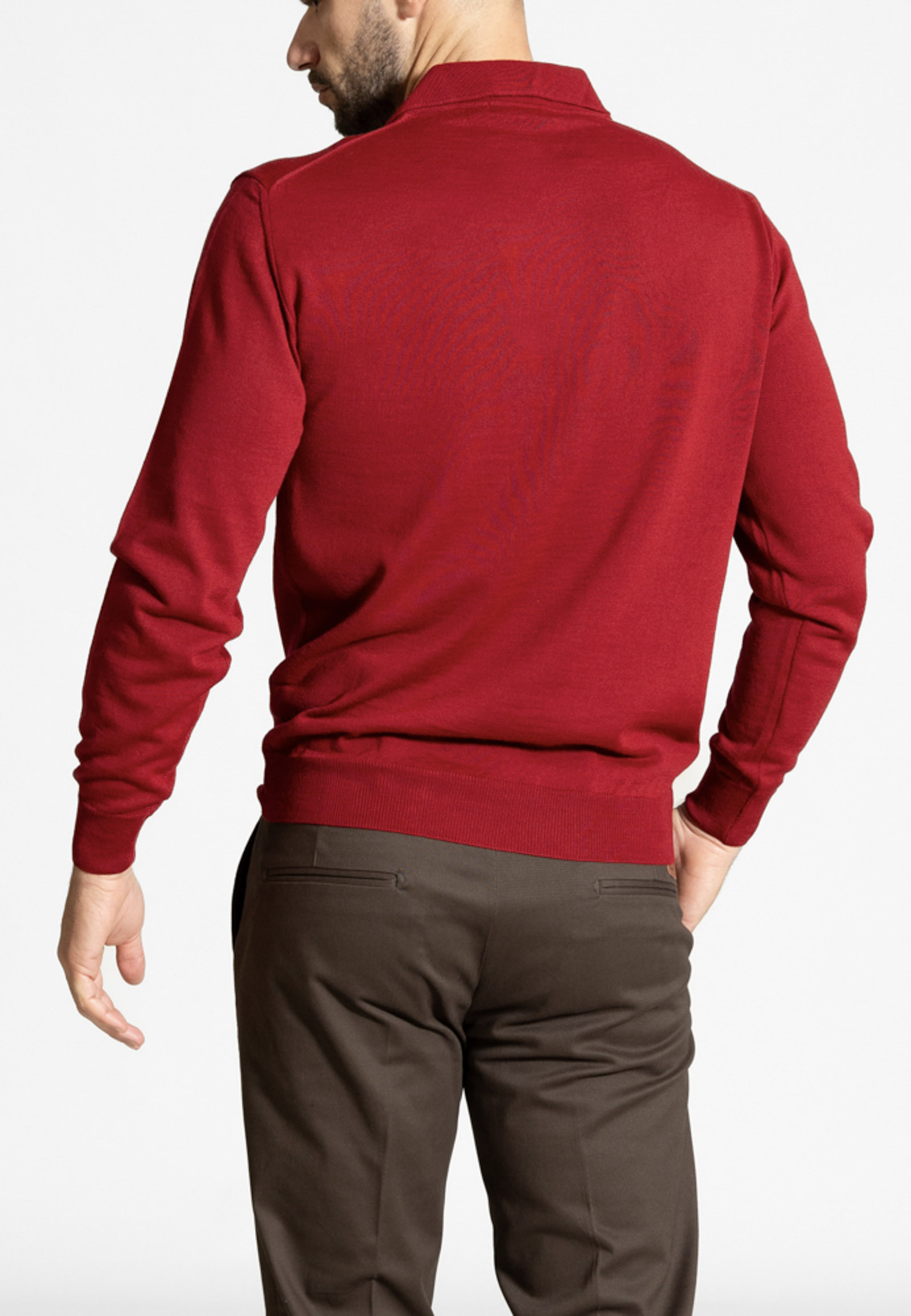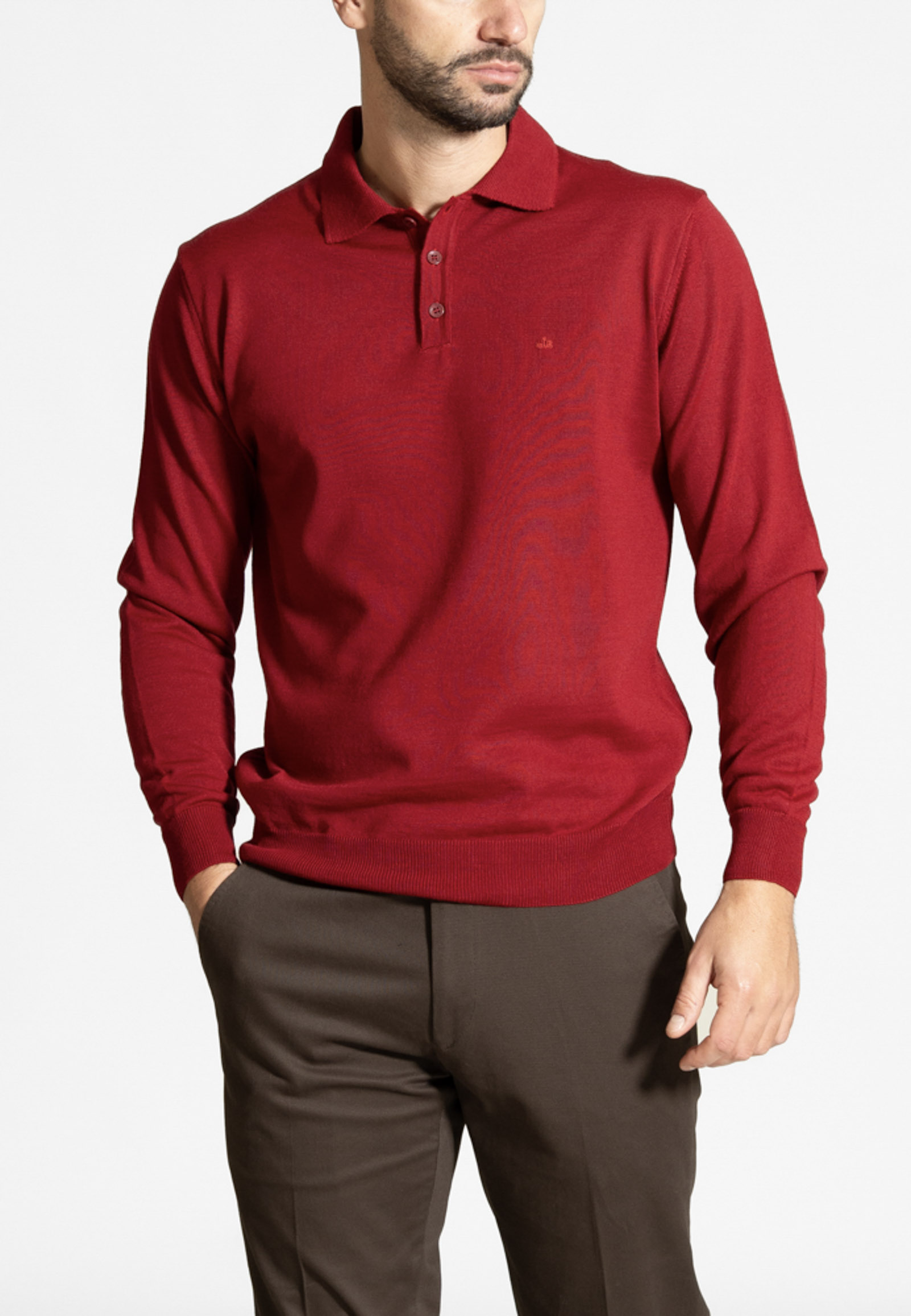 Πλεκτό με γιακά πόλο από extra fine μαλλί μερινός σε κανονική γραμμή. Πατιλέτα με τρία κουμπιά, ύφανση λεπτή και ριπ τελείωμα στο κάτω μέρος και στο μανίκι.