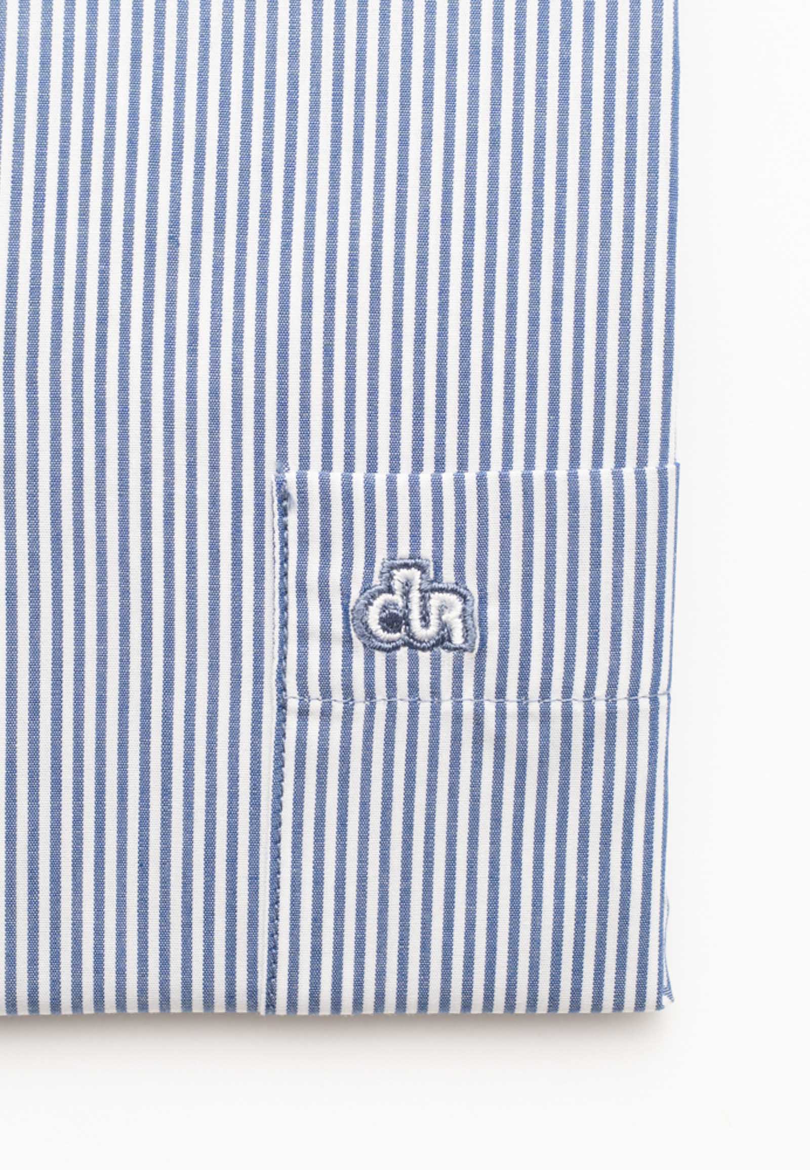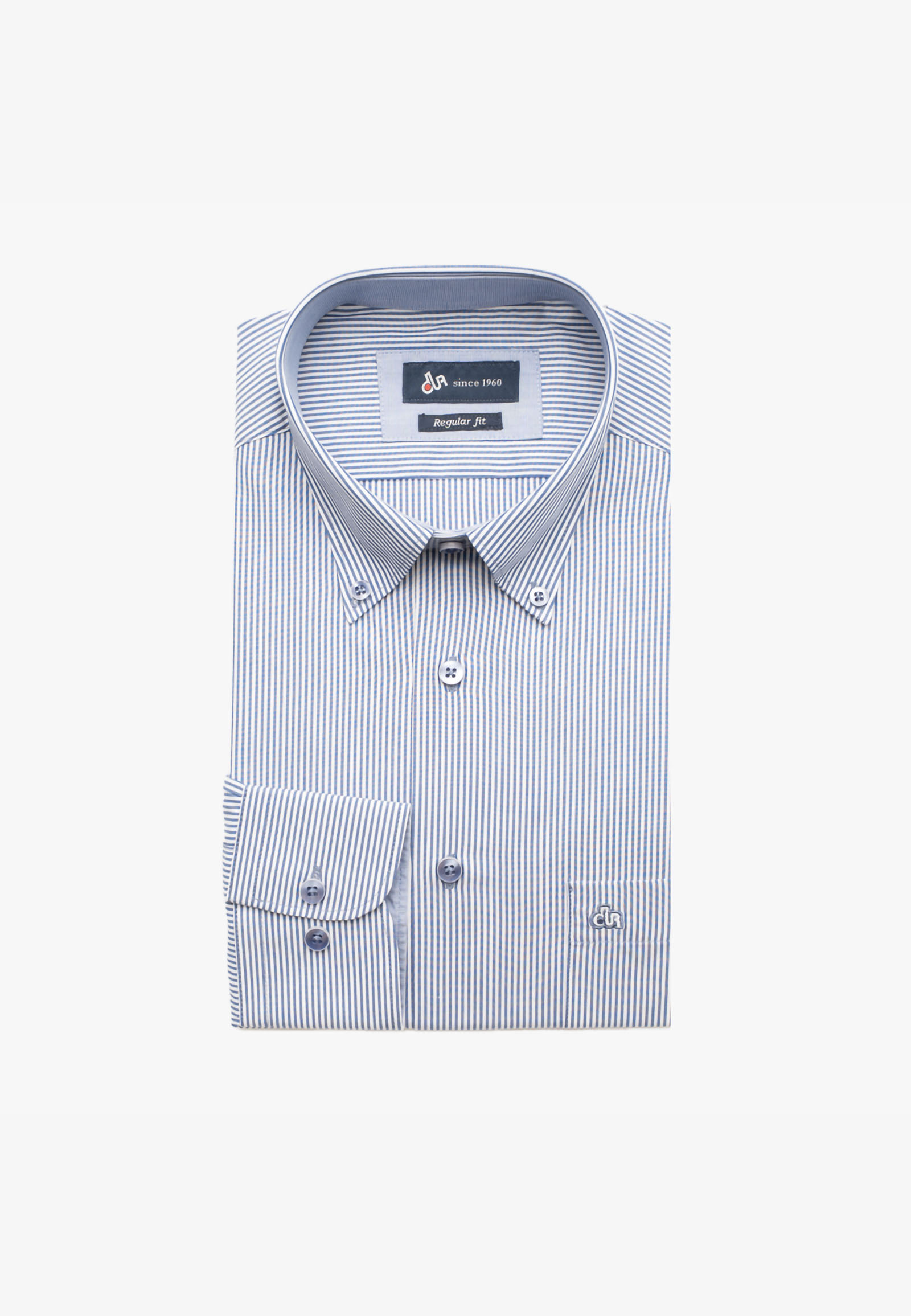Πουκάμισο ριγέ με εσωτερικό γαρνίρισμα στον γιακά και την πατιλέτα σε κανονική γραμμή. Γιακάς με κουμπί, κλείσιμο με κλασική πατιλέτα, τσέπη τρίγωνη, μανσέτα στρογγυλή και δύο πιέτες στην ωμοπλάτη για άνεση στην κίνηση. Το λογότυπο κεντημένο στη τσέπη.