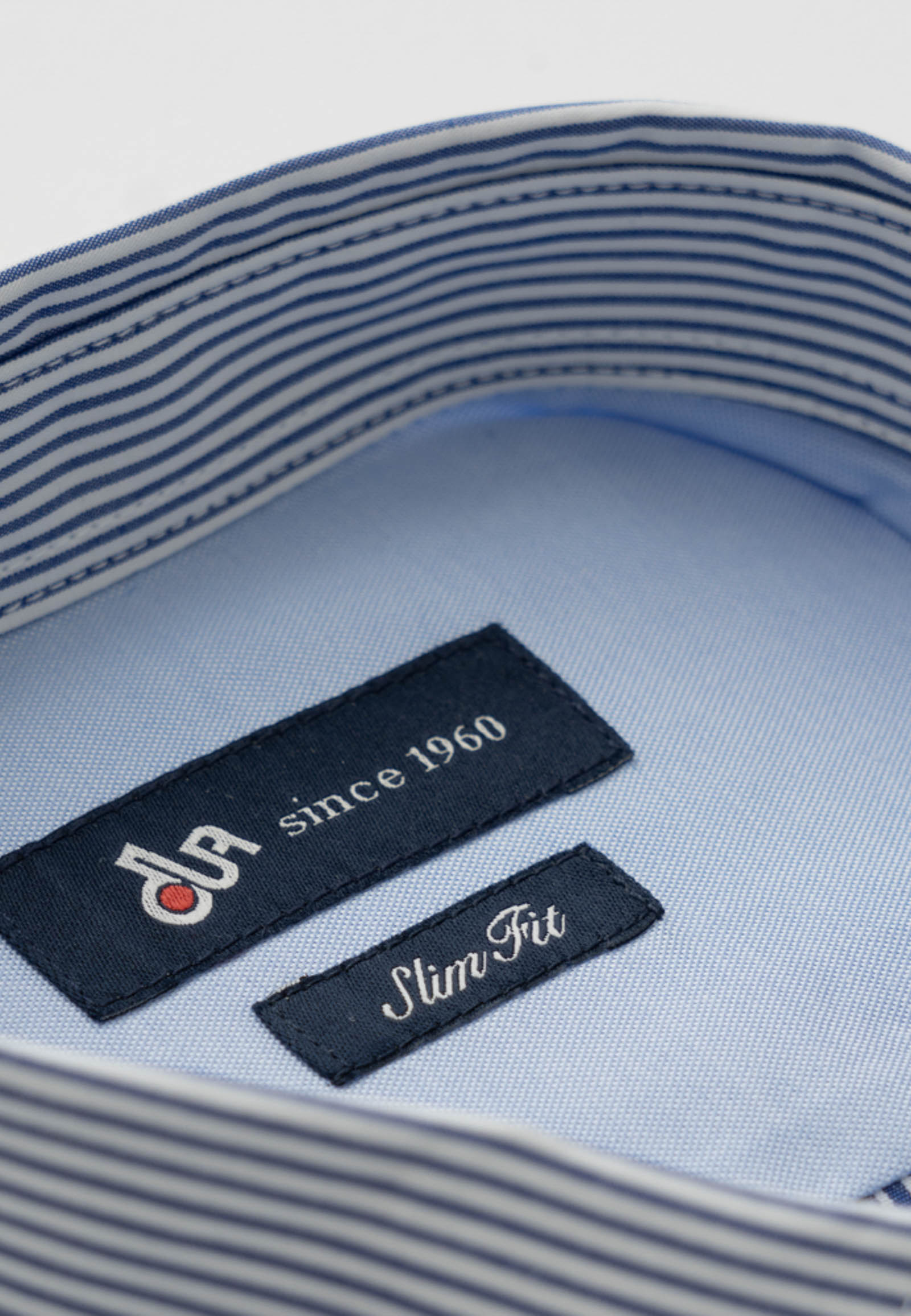 Πουκάμισο ριγέ με κοπή ραφή που συνδυάζει δύο διαφορετικές ρίγες. Γιακάς μικρός rex, κλασική πατιλέτα 6 κουμπιών και μανσέτα στρογγυλή. Το λογότυπο κεντημένο στο στήθος. Γραμμή σώματος στενή.