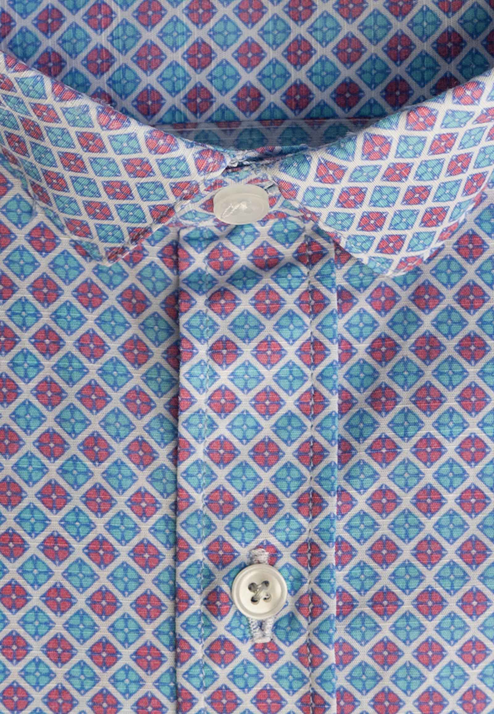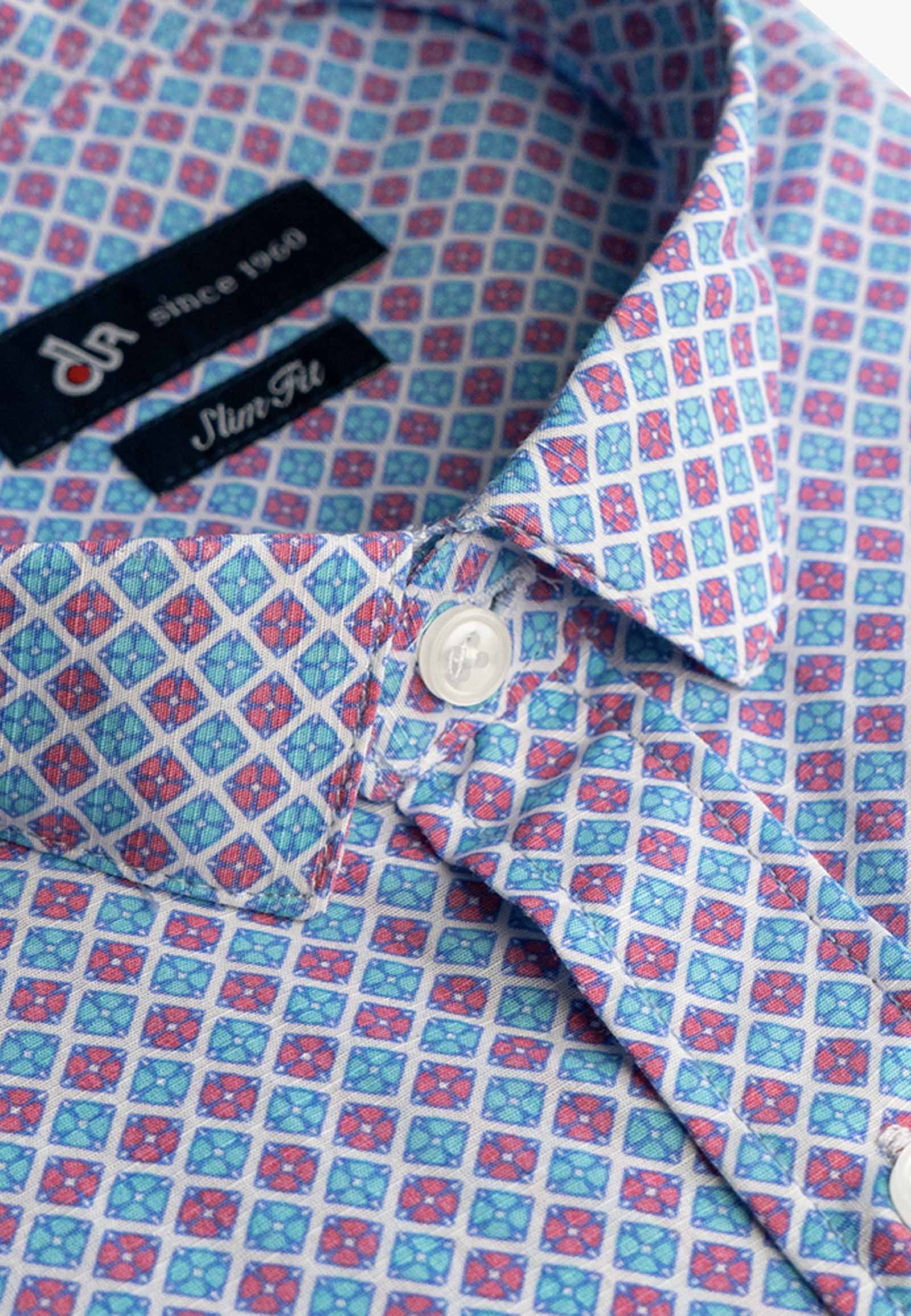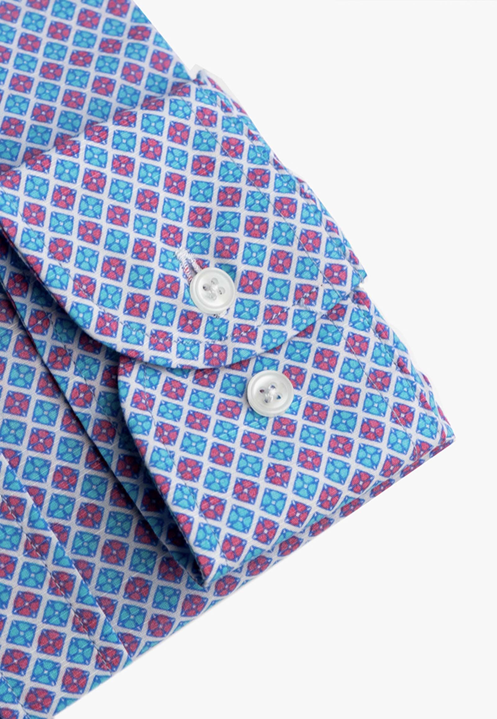 Πουκάμισο ζακάρ πολύ ελαφρύ σε στενή γραμμή. Γιακάς μαλακός μυτερός και μανσέτα στρογγυλή με κεντημένο το λογότυπο και δύο ρυθμιζόμενα κουμπιά. Κλείσιμο με πατιλετομηχανή έξι κουμπιών. Δύο πένσες στην πλάτη για καλύτερη εφαρμογή.