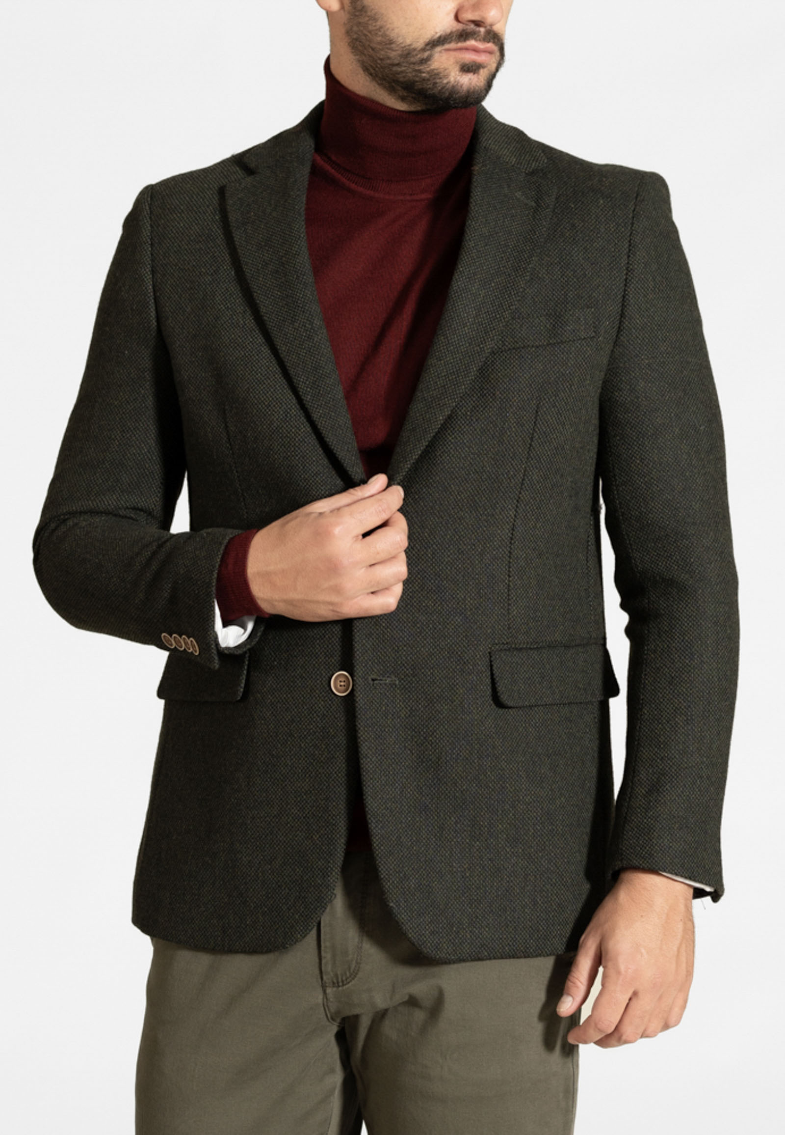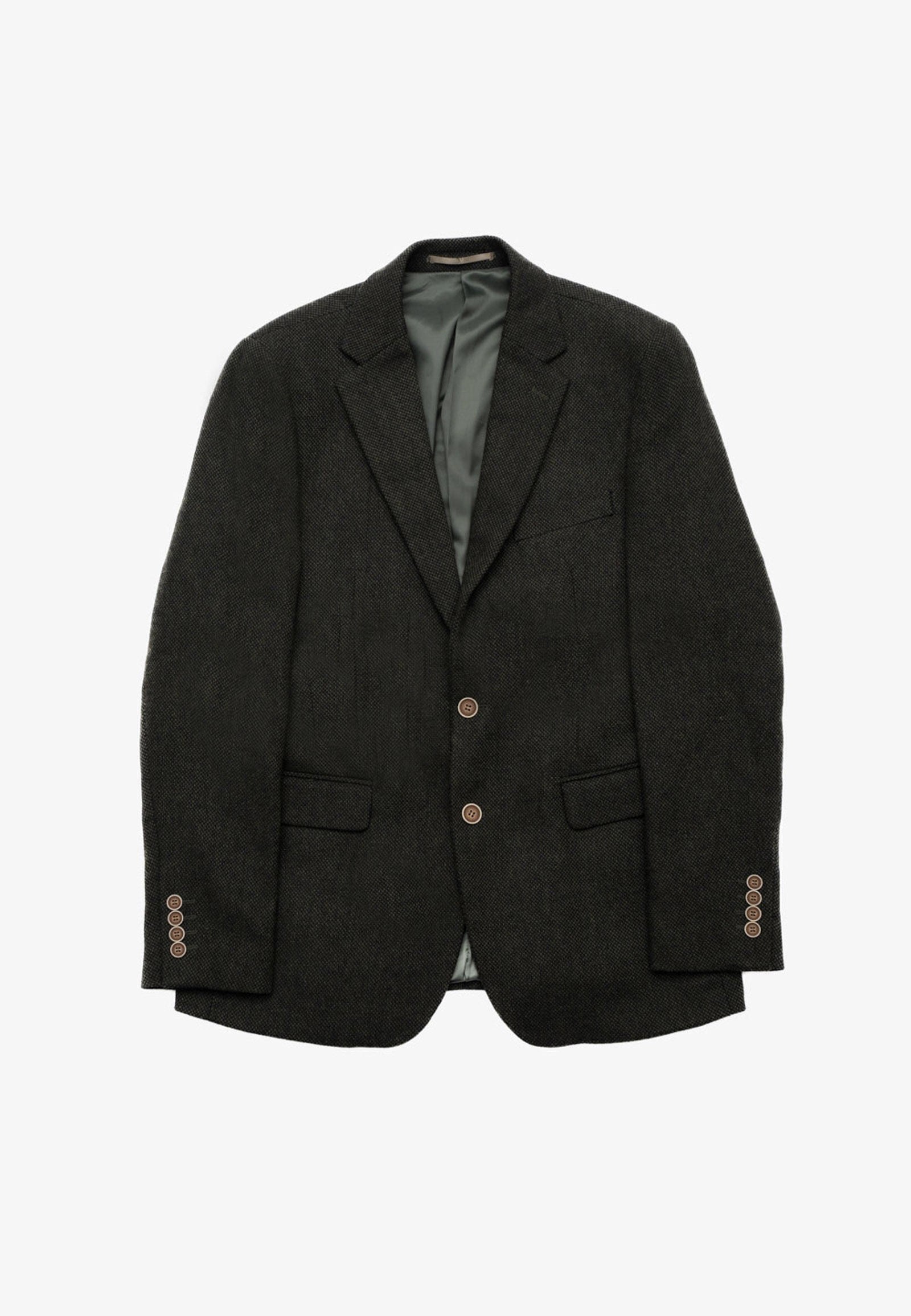 Σακάκι Tweed σύμμικτο από μαλλί σε μεσάτη γραμμή. Κλείσιμο με δύο κουμπιά και τέσσερα κουμπιά στα μανίκια. Δύο εξωτερικές τσέπες καπάκι, μία τσέπη κρυφή στο στήθος και δύο εσωτερικές. Διπλό άνοιγμα στο πίσω μέρος, φοδραρισμένο εσωτερικά και λεπτομέρεια κλειστή κουμπότρυπα στο πέτο.